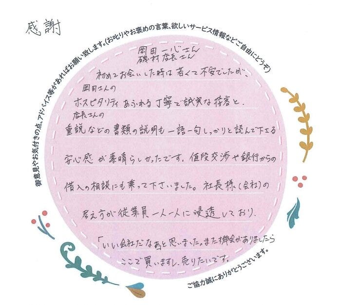 今回のお取引におきましてU様のお力になれましたようで、安堵の気持ちでいっぱいです。